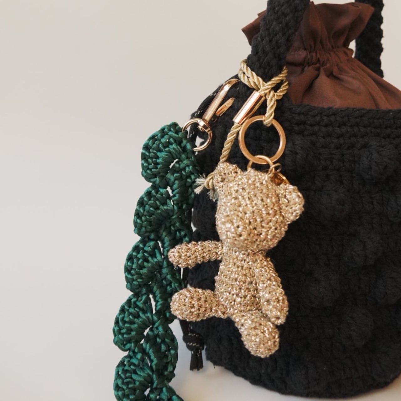 “choi choi” のバッグはしっかりした糸で編まれているので、編み目に直接ナスカンを取り付けることができます。ポイントは編み糸2本分の編み目に通すこと。