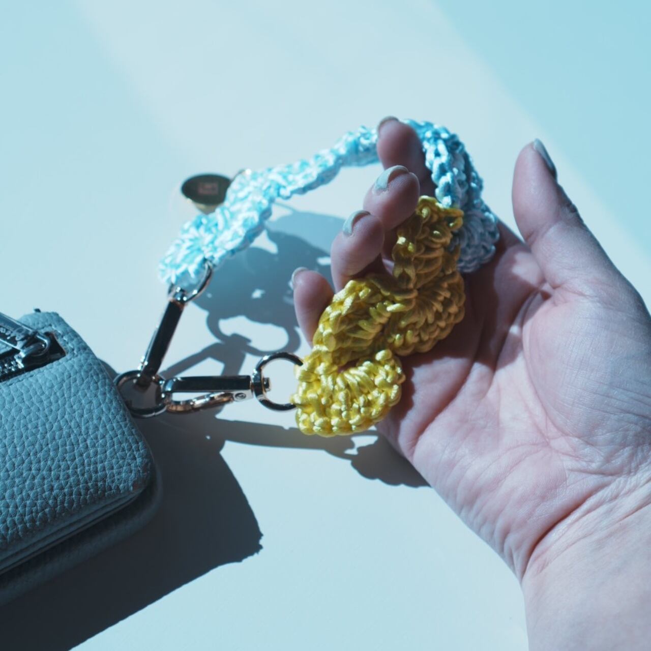 ※“choi choi” のバッグはしっかりした糸で編まれているので、編み目に直接ナスカンを取り付けることができます。ポイントは編み糸2本分の編み目に通すこと。