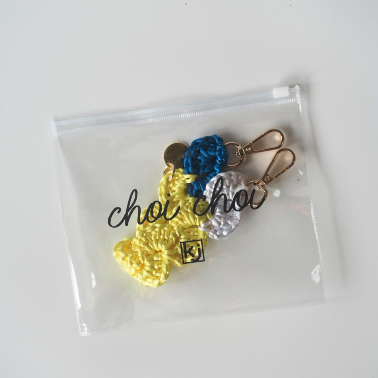 “choi choi” のバッグはしっかりした糸で編まれているので、編み目に直接ナスカンを取り付けることができます。ポイントは編み糸2本分の編み目に通すこと。