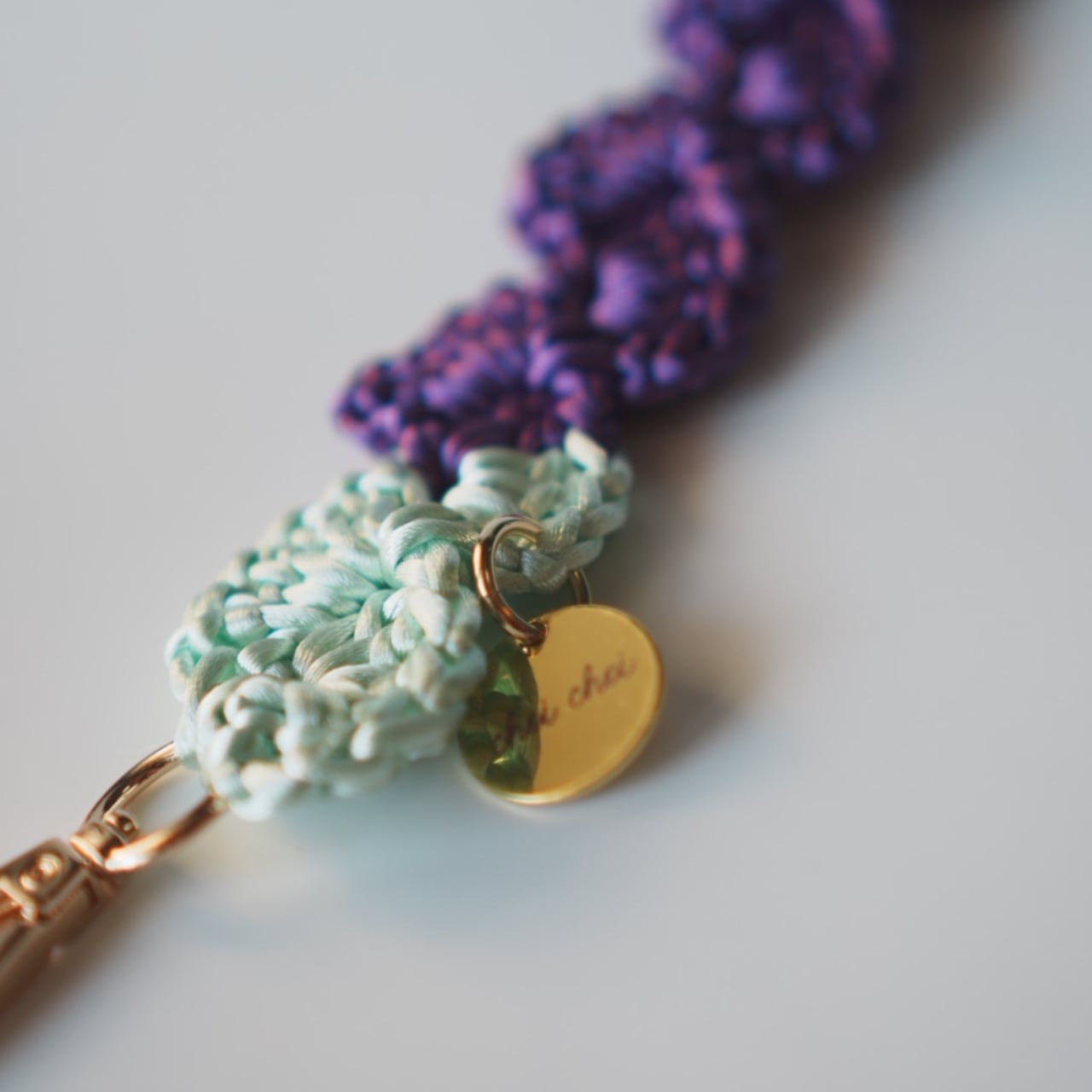 “choi choi” のバッグはしっかりした糸で編まれているので、編み目に直接ナスカンを取り付けることができます。ポイントは編み糸2本分の編み目に通すこと。