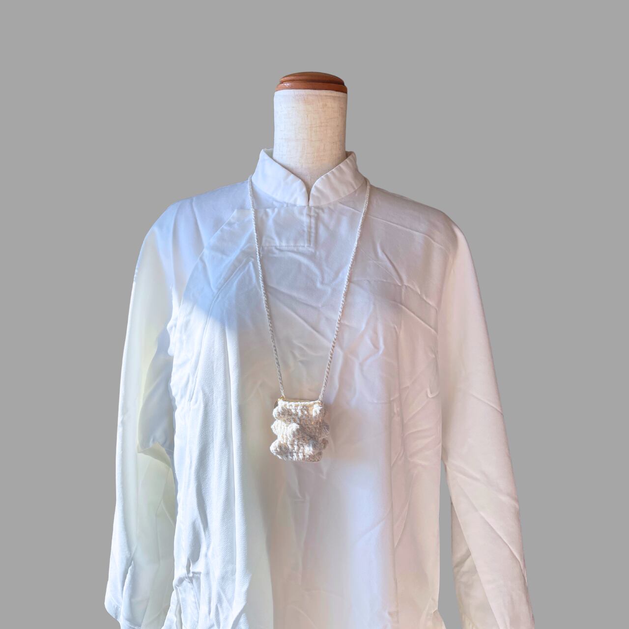 素朴な風合いのシルク糸で編んだバッグモチーフのアクセサリー